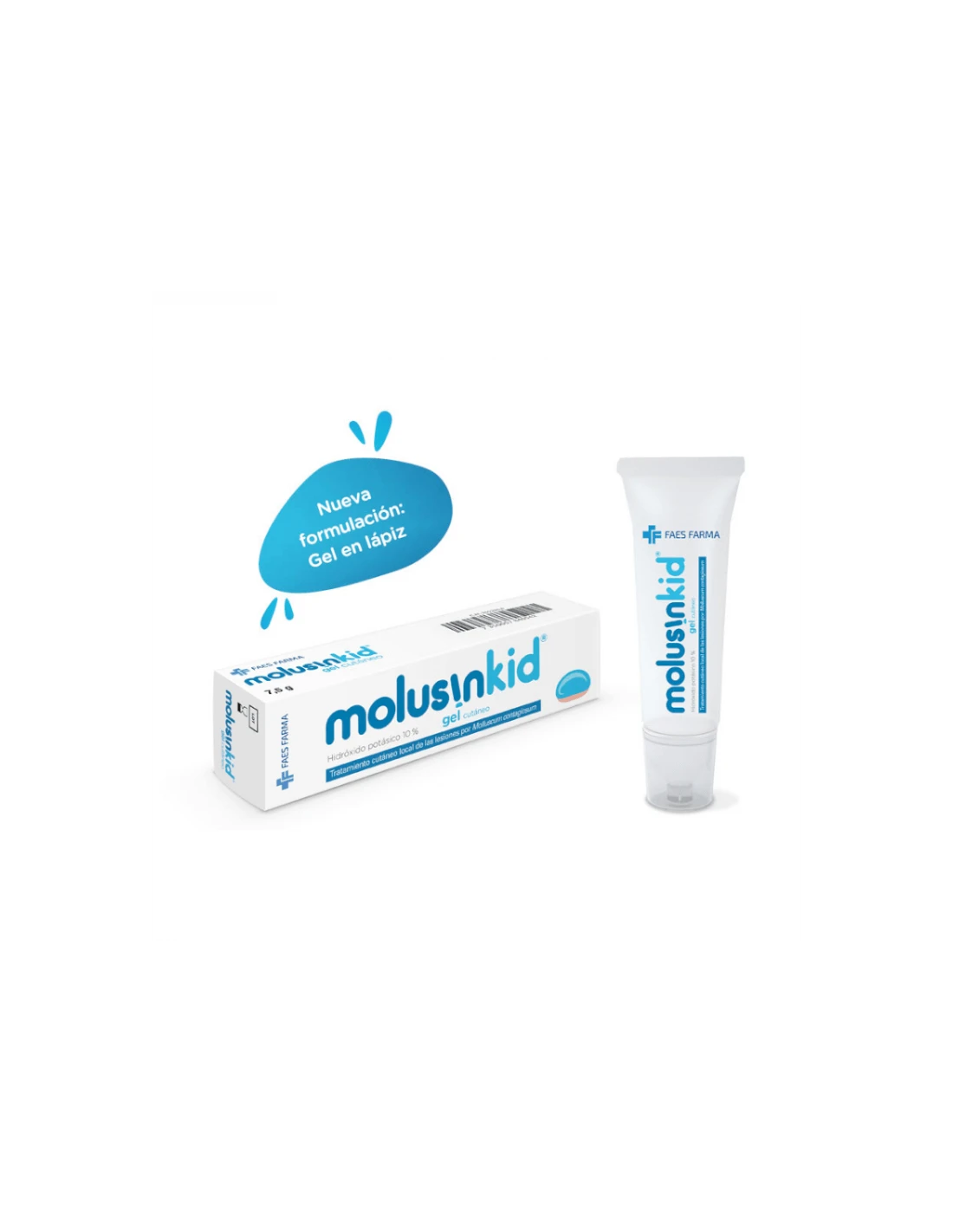 Molusinkid Gel cutáneo se presenta en formato tubo que contiene 7.5 gr de producto sanitario. Este contiene hidróxido potásico al 10%, con un valor de pH muy alcalino, proporcionando un efecto cauterizante sobre la lesión.